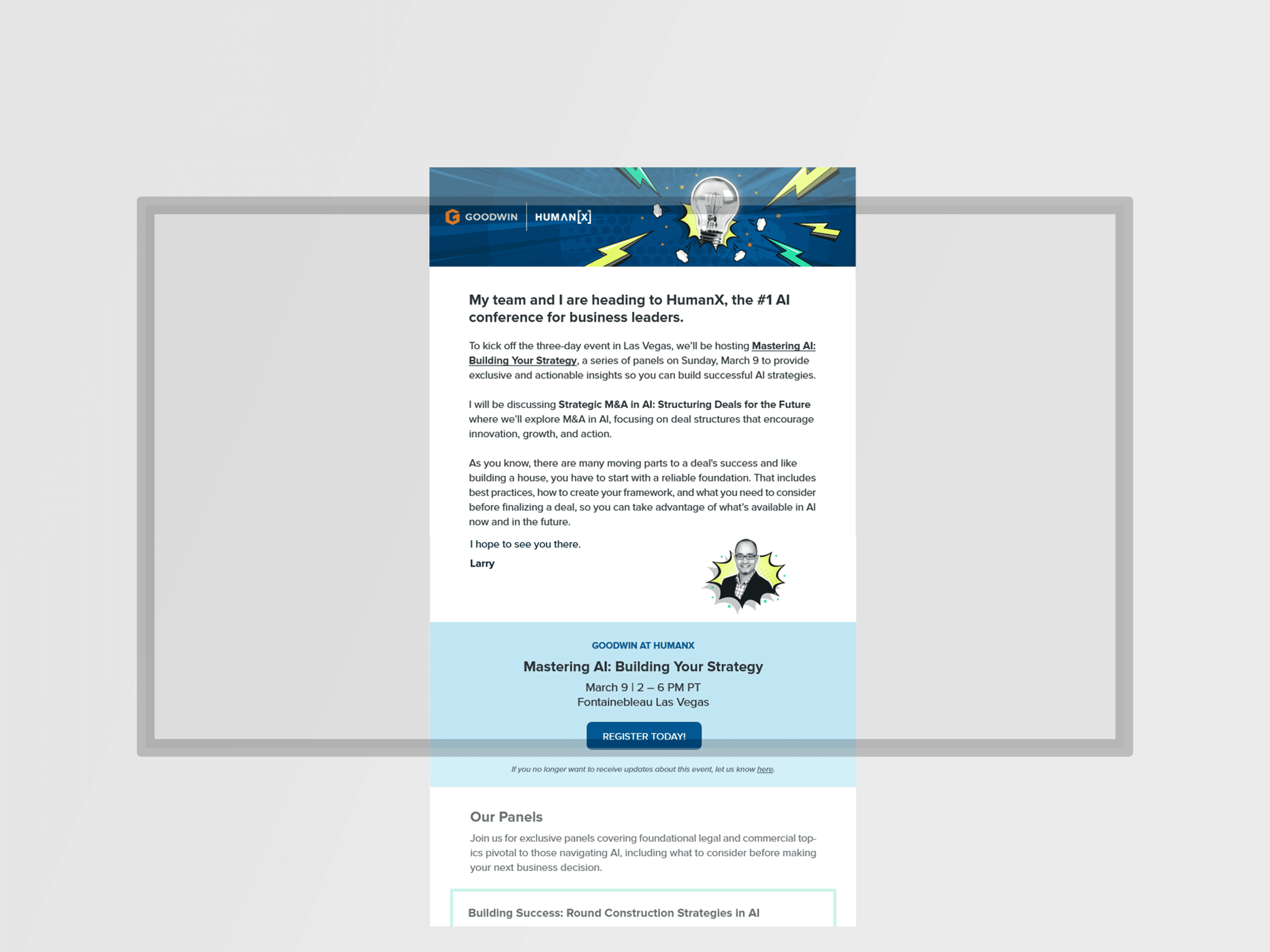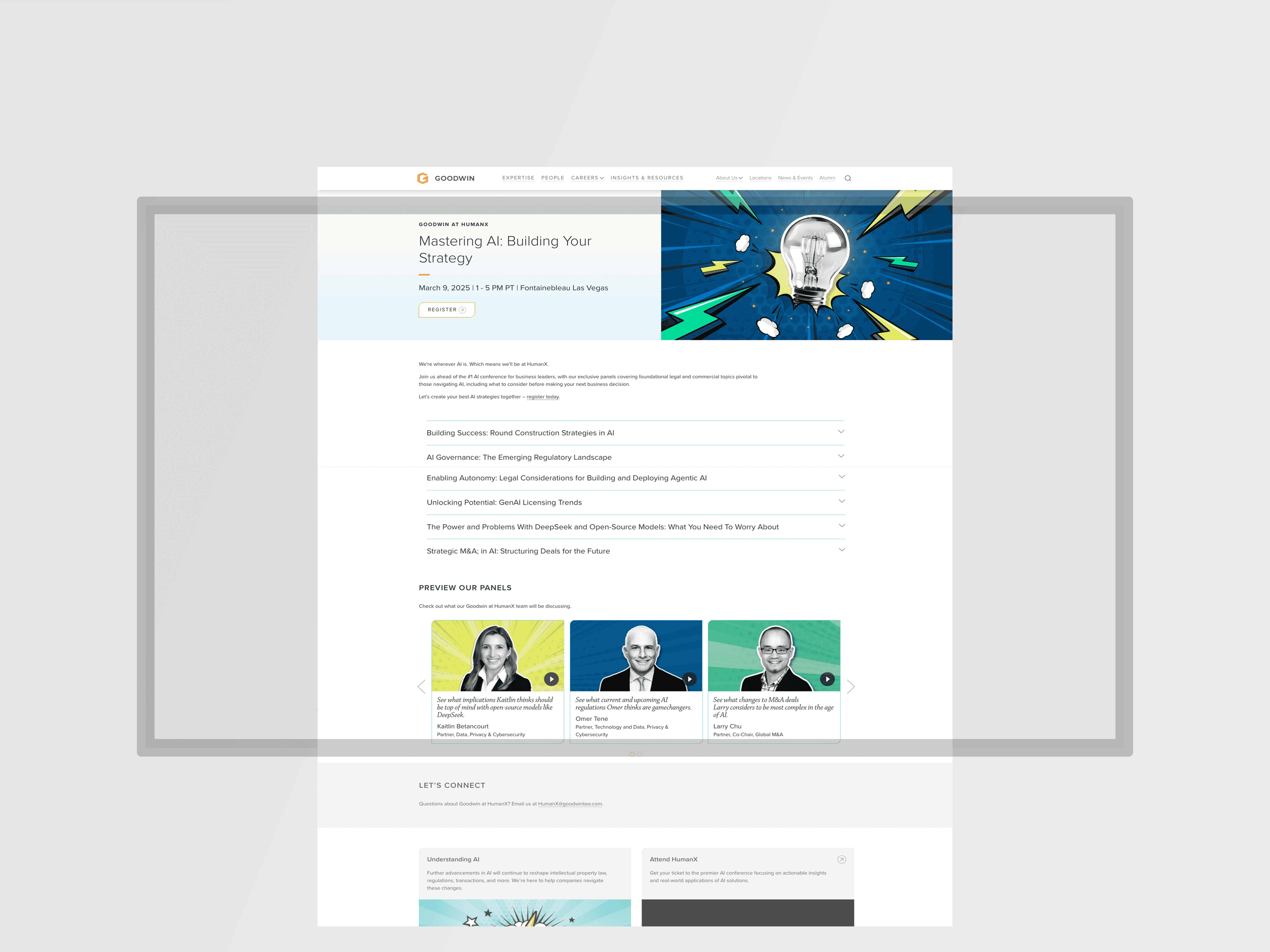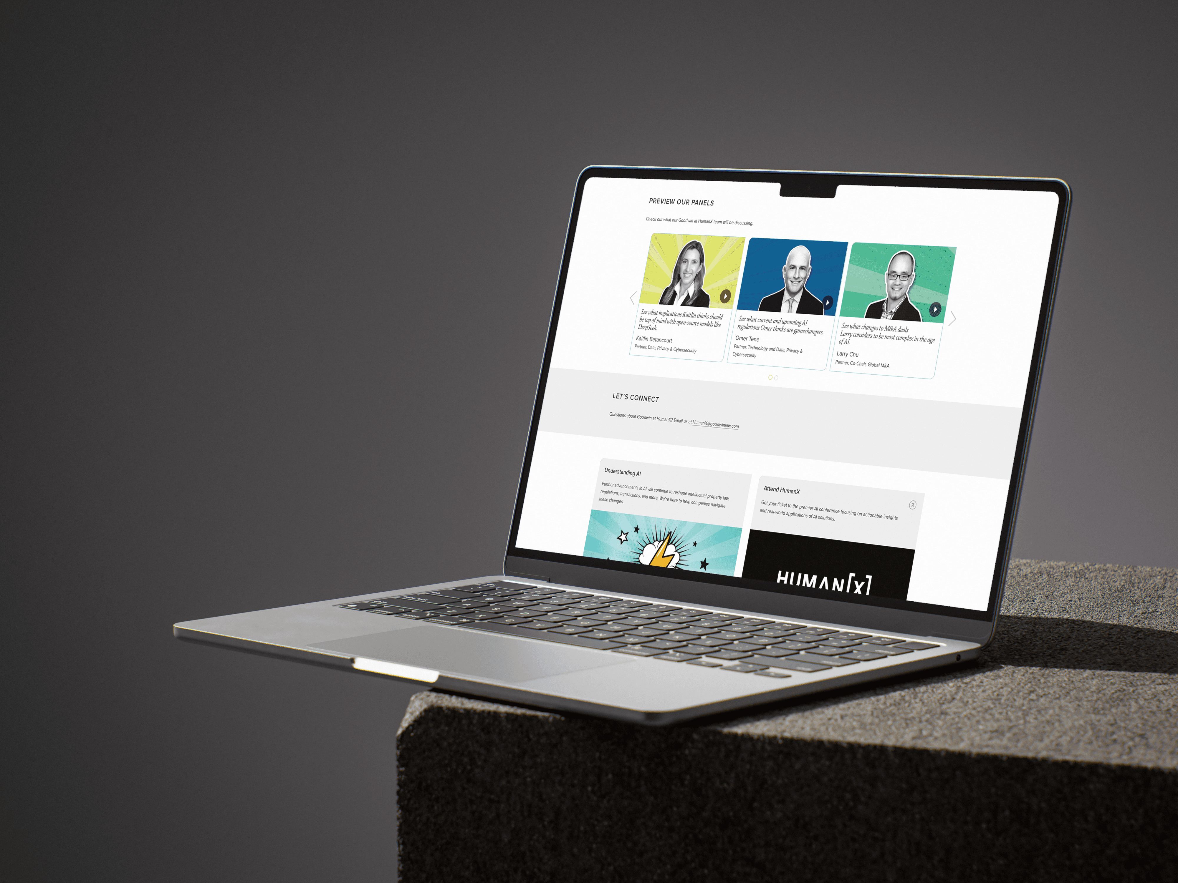 As a sponsor at HumanX, an AI and tech conference, Goodwin partners led a panel covering industry topics related to artificial intelligence from a legal lens. Requested specifically to make our sponsorship advert more impactful and distinct from competitors, I introduced a new approach to
