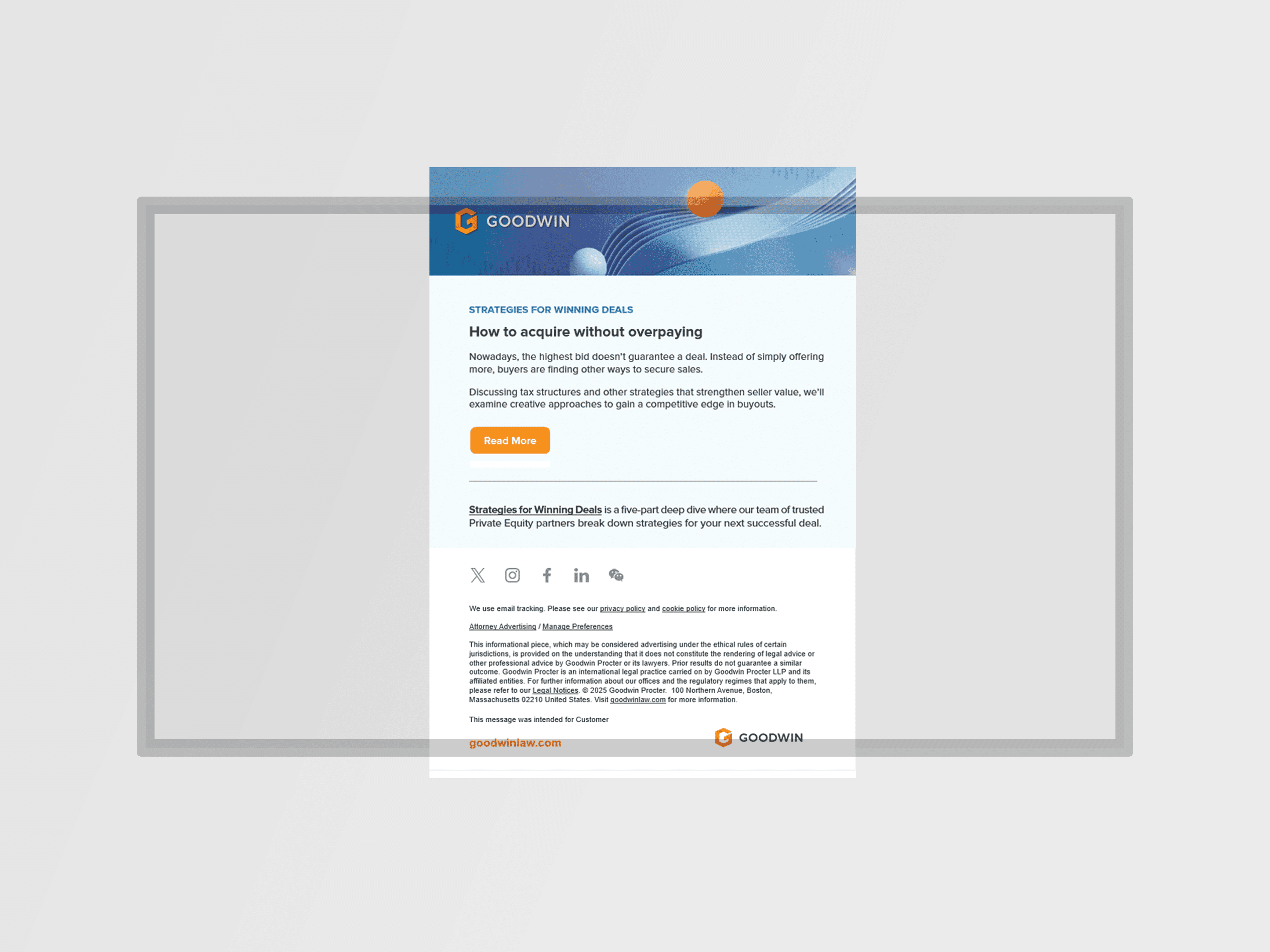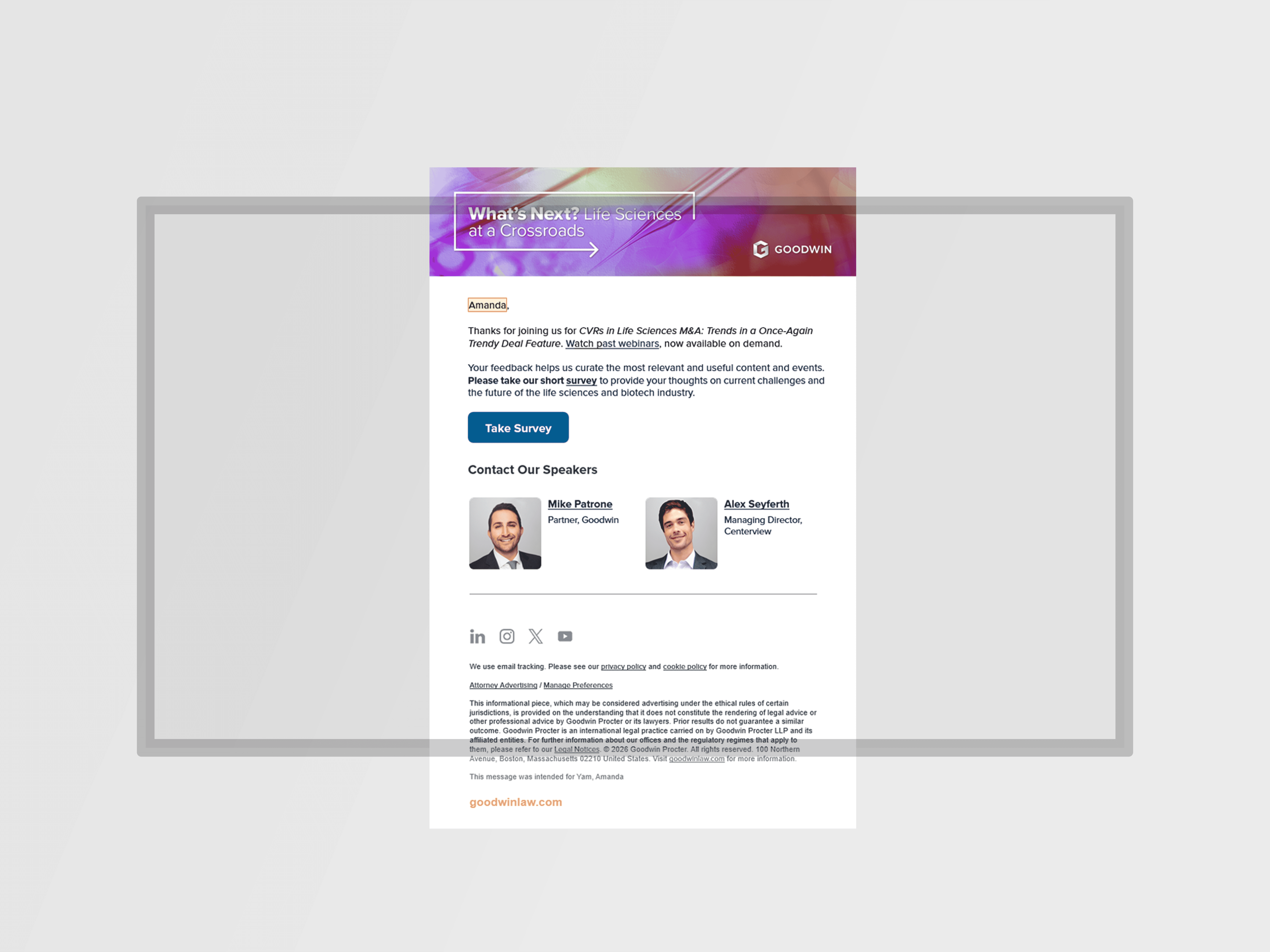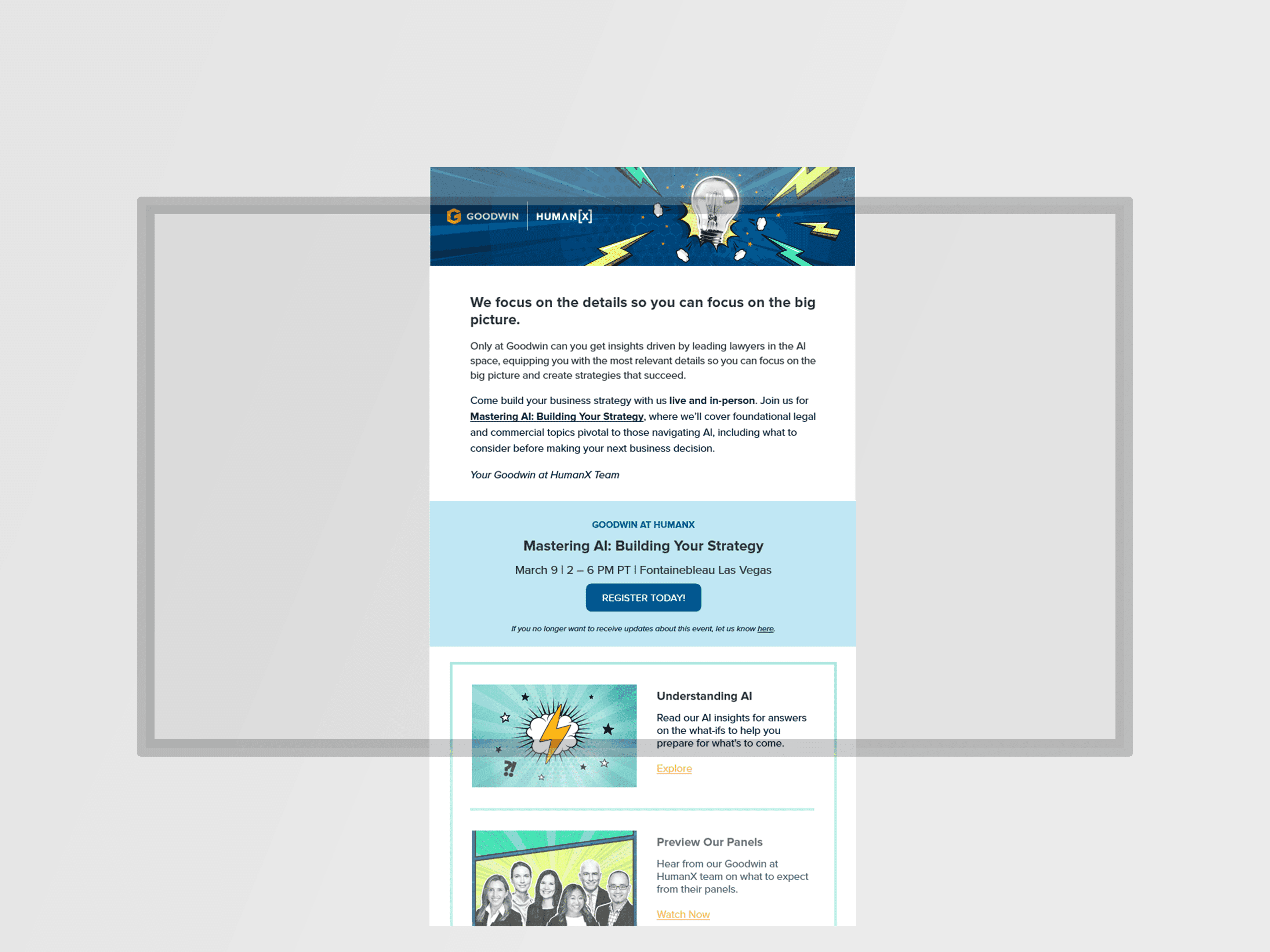 During my time, Goodwin's marketing efforts evolved and expanded greatly, with many areas reflective of my contributions as a copywriter and strategist. A prime example is how we approached Mastering AI: Building Your Strategy, our first event campaign; this was the first venture in delivering on an integrated campaign for a firm event that extended into social, email, and web.